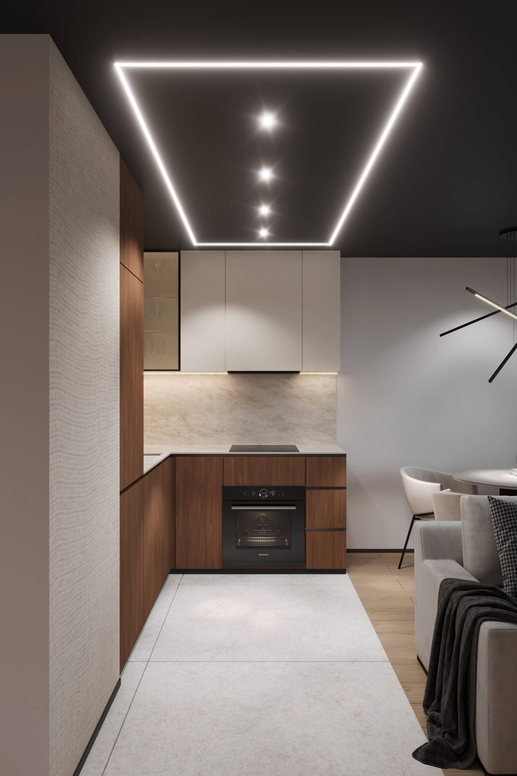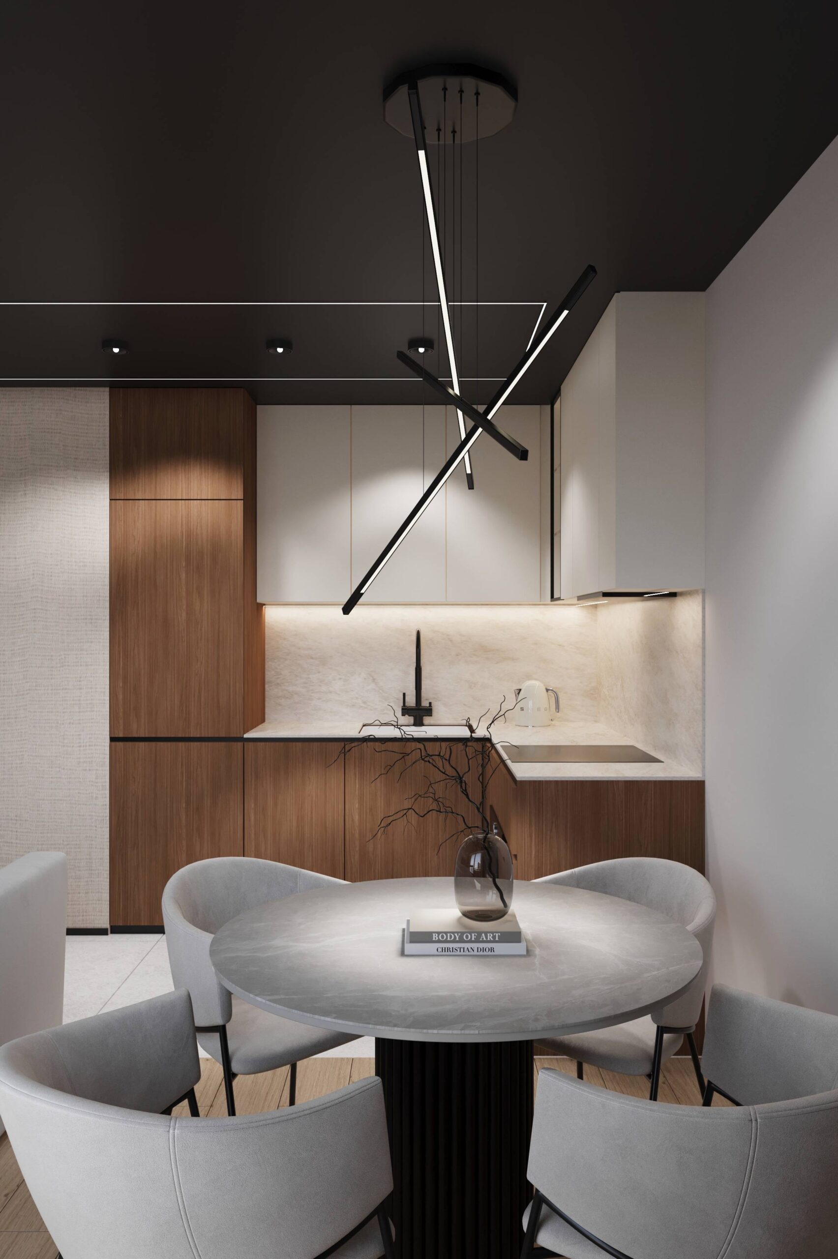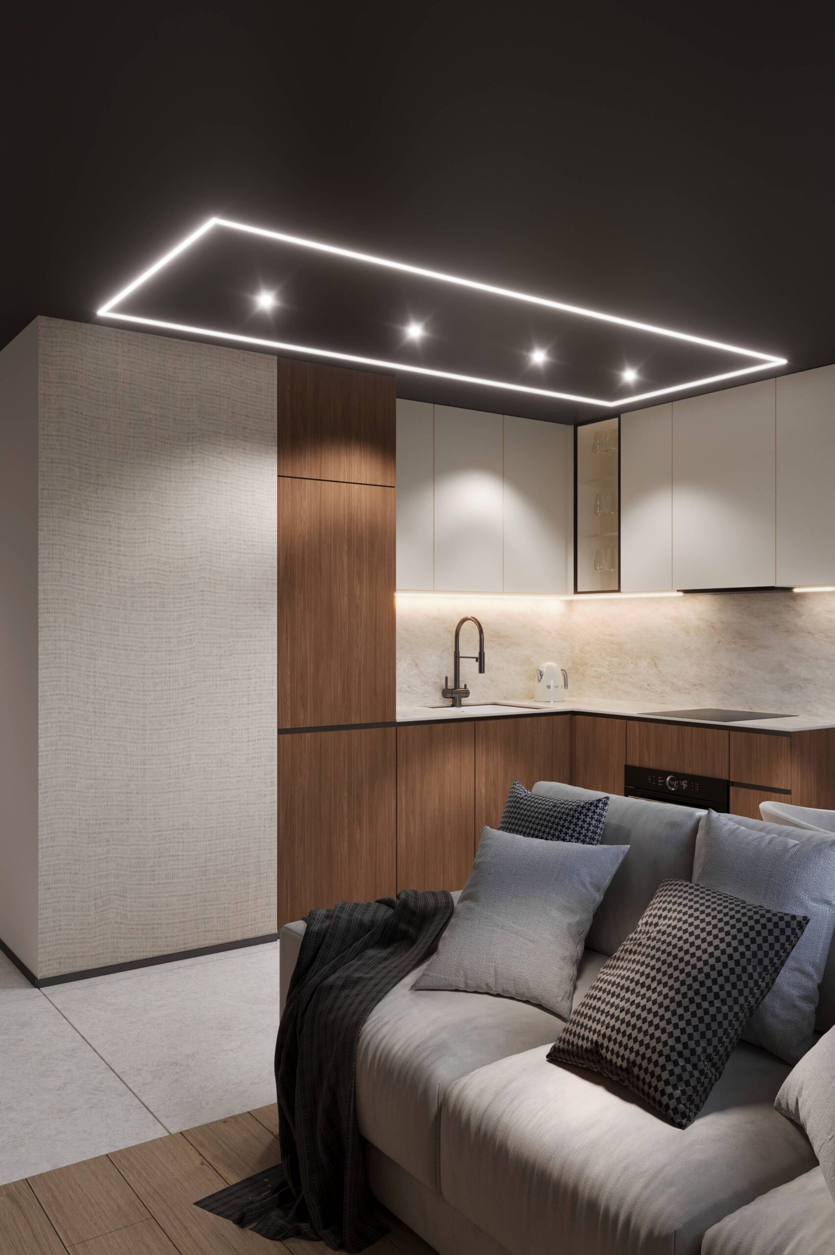 Nowoczesne mieszkanie w Warszawie, w którym jasna baza została przełamana czarnym sufitem i wyrazistym oświetleniem.