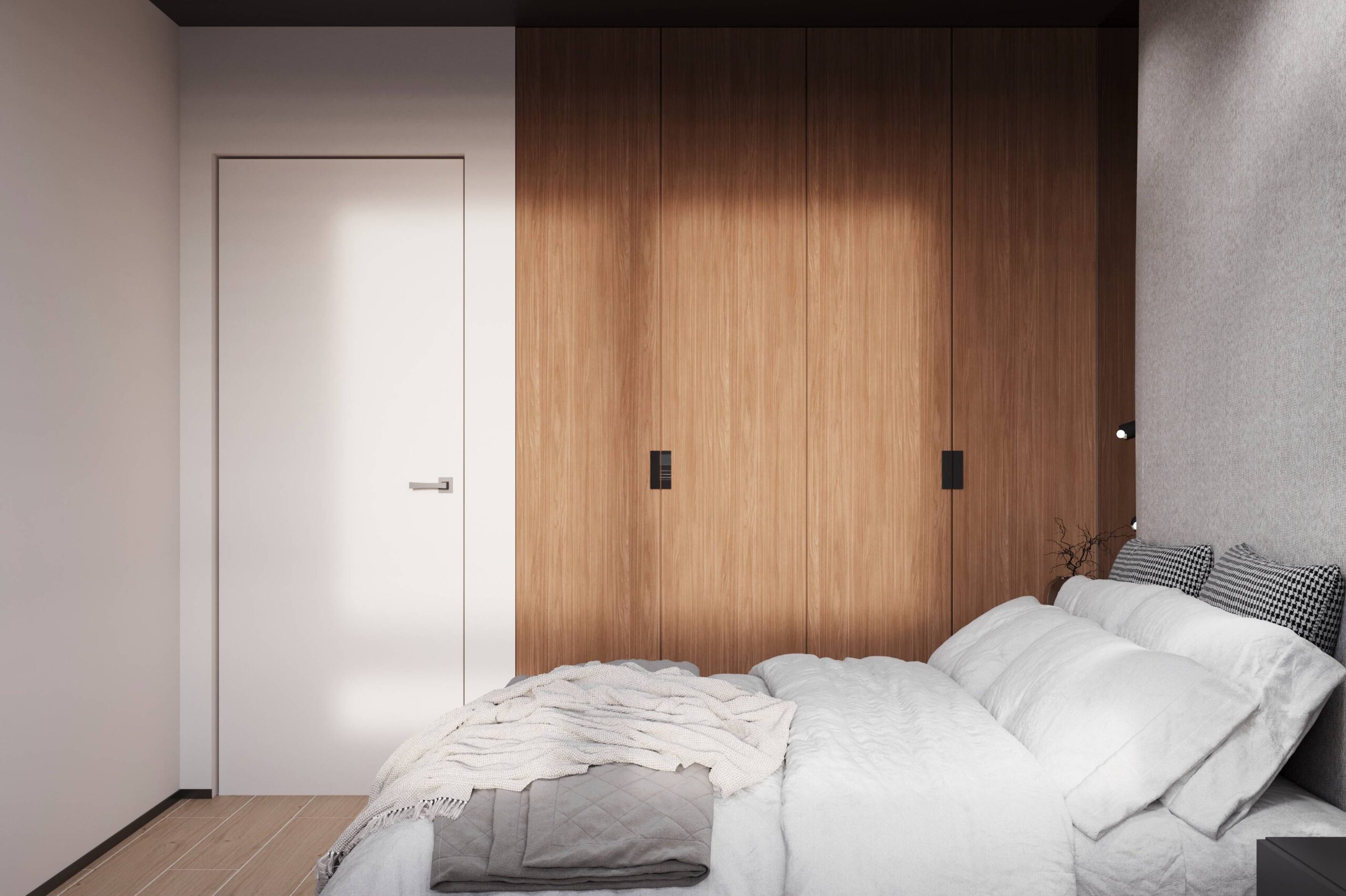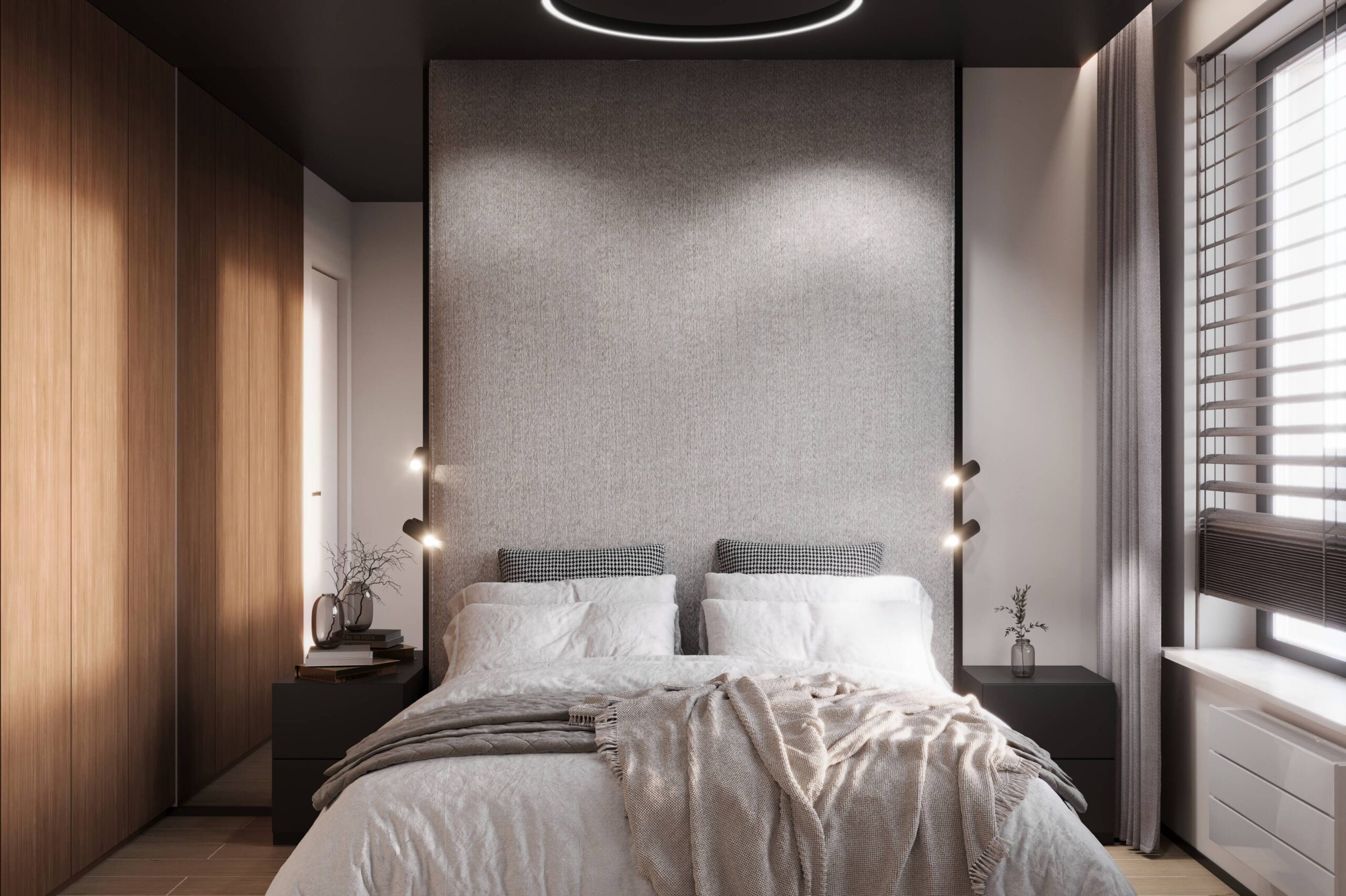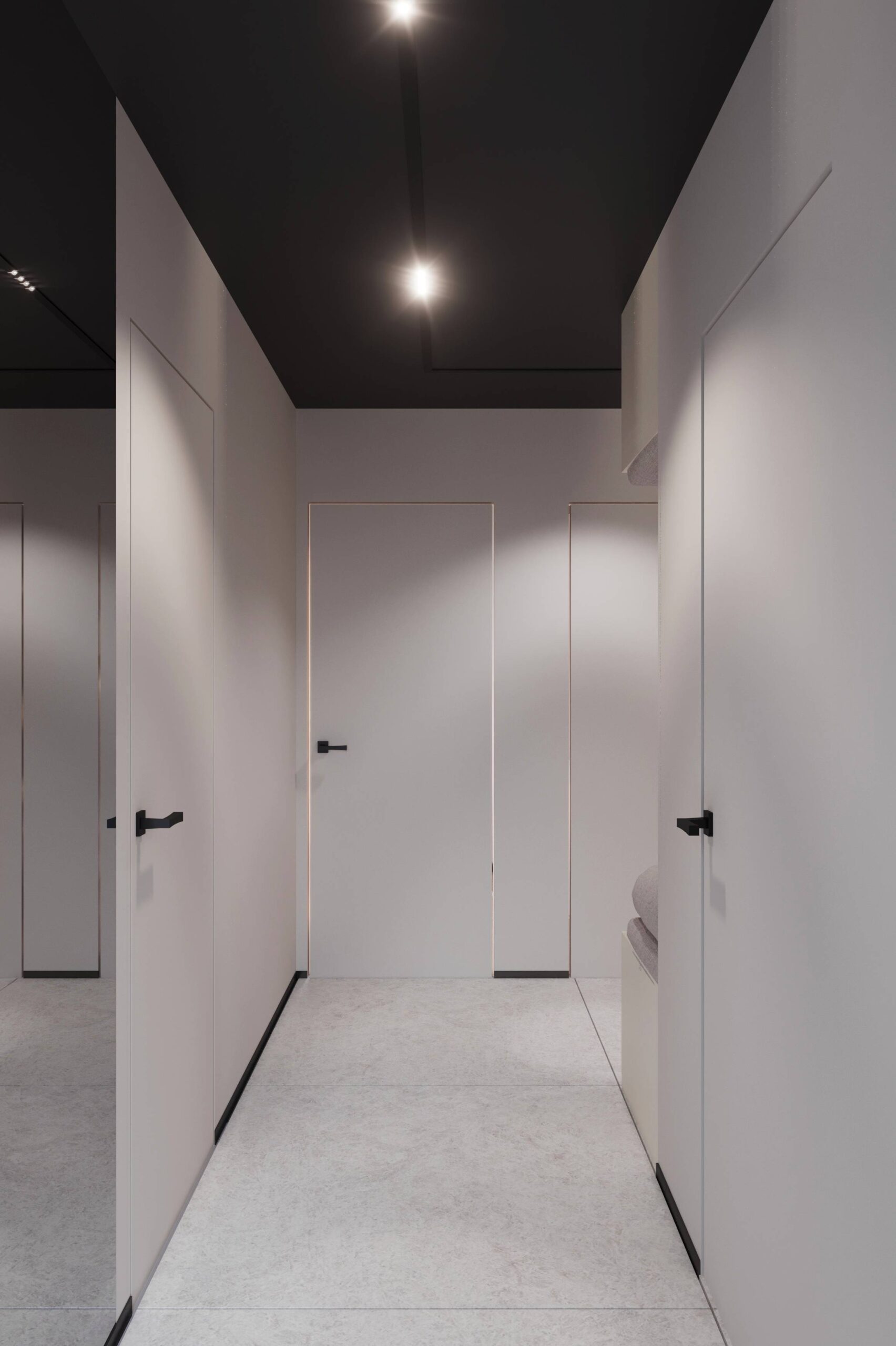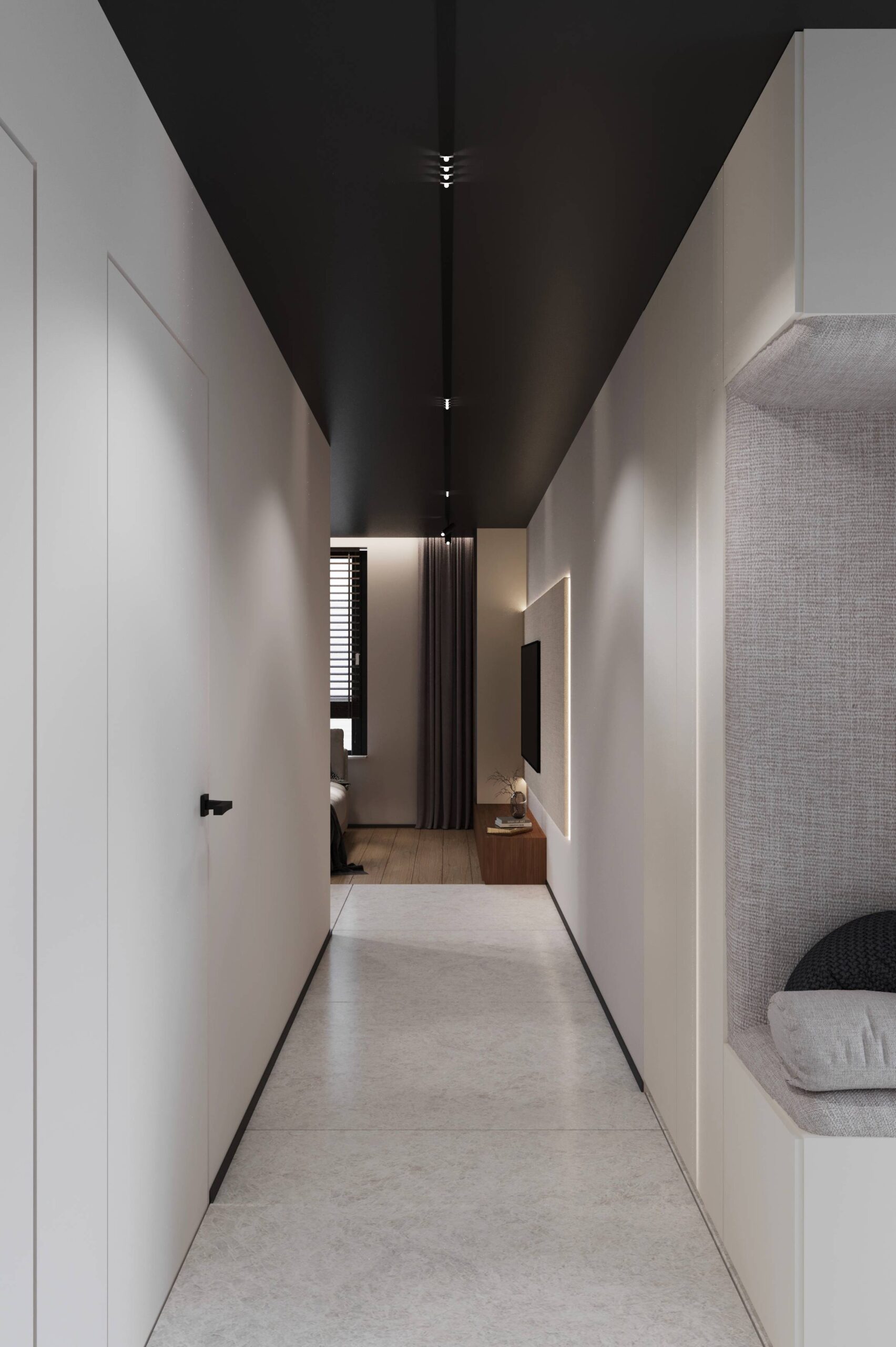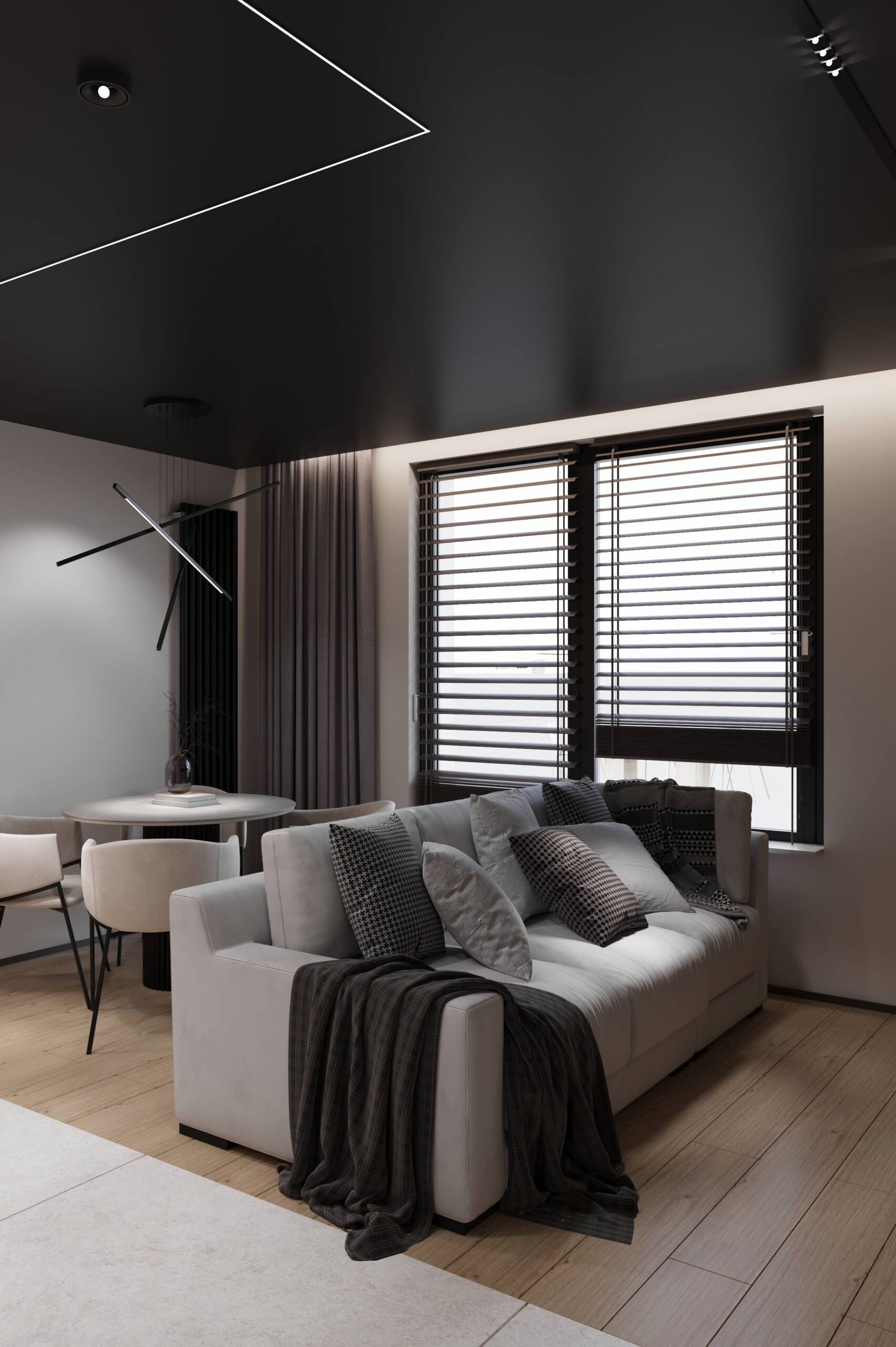 Projekt mieszkania w Warszawie oparty jest na jasnej, neutralnej kolorystyce, która optycznie powiększa przestrzeń i stanowi spokojne tło dla mocniejszych akcentów. Czarne wykończenie sufitu nadaje wnętrzu nowoczesnego, zdecydowanego charakteru i porządkuje strefy funkcjonalne.